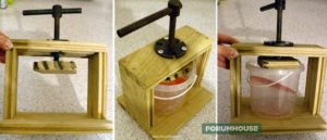 Как вариант, для приготовления сыра можно использовать винтовое устройство, которым пользуются виноделы для отжима сока из фруктов и ягод. При желании изготовить можно такие прессы для сыра своими руками. Для этого необходимо отыскать подходящую струбцину, подобрав под нее соответствующую емкость для укладки основы будущего продукта.