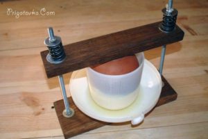 В данном случае основа будущего сыра помещается в марлевую сумку, укладывается на платформу и прижимается камнем. Выдерживать продукт в таком состоянии можно как под навесом на улице, так и в хорошо проветриваемом помещении.