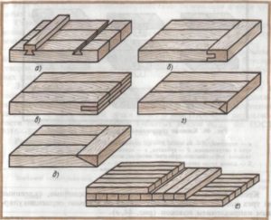а — ступенчатое; б — на ус с затуплением; в — ступенчатое с выступом; г — ступенчатое на ус с затуплением; д — ступенчатое с выступом и клиньями; е — ступенчатое на ус с затуплением и клиньями; ж — впритык.
