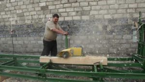 В самодельных конструкциях применяется ручная система подачи заготовки. На станине расположены направляющие ролики, по которым двигается брус к блоку заготовки.